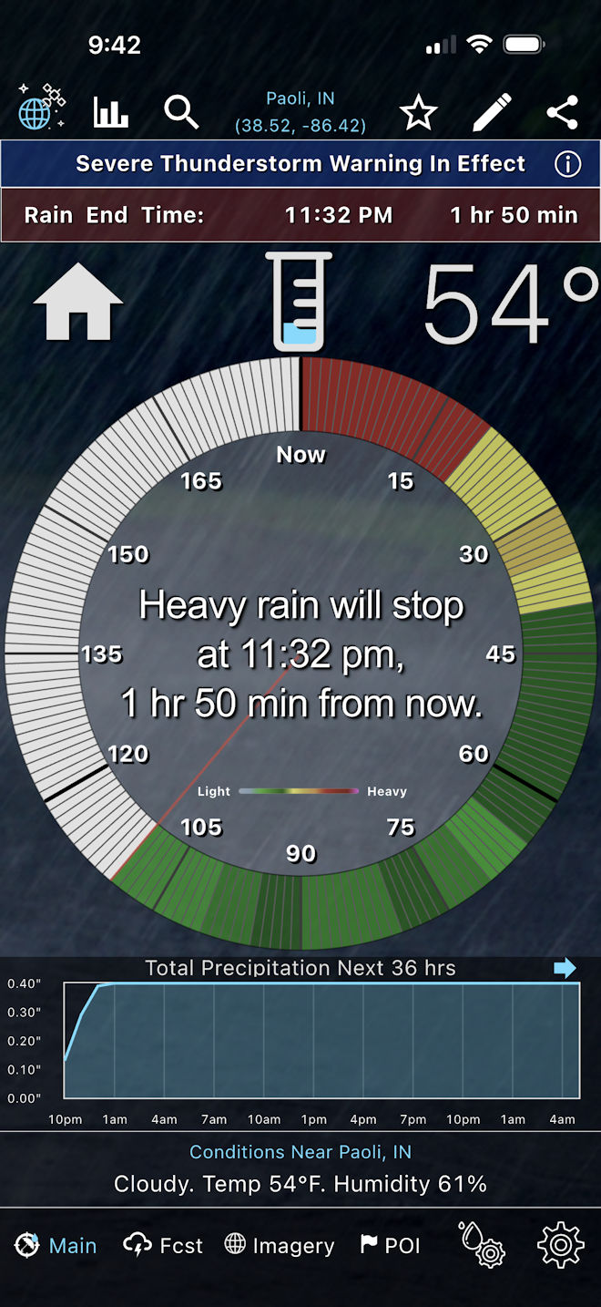 Tip: If you see the "Home" icon on your main RainClock screen, it means the app is "at" another location. Similarly, the locator at the top of the screen will have a different font color. Tap the home icon to return to base.